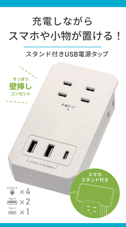 HIDISC スマホスタンド付き薄型USB電源タップ ACx4 Type-Ax2 Type-Cx1 HD-AC4U2C1STWH