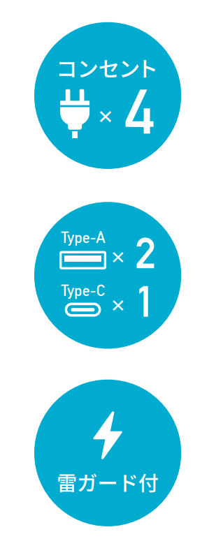 ? コンセント4口、 USB Type-A 2口、 USB Type-C 1口の充実 のポート数