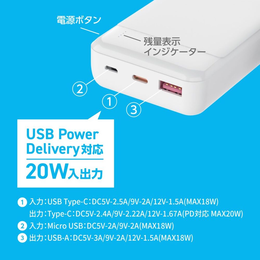 ・USB Type-C: DC5V/2.4A, 9V/2.22A, 12V/1.67A (PD対応 20W)