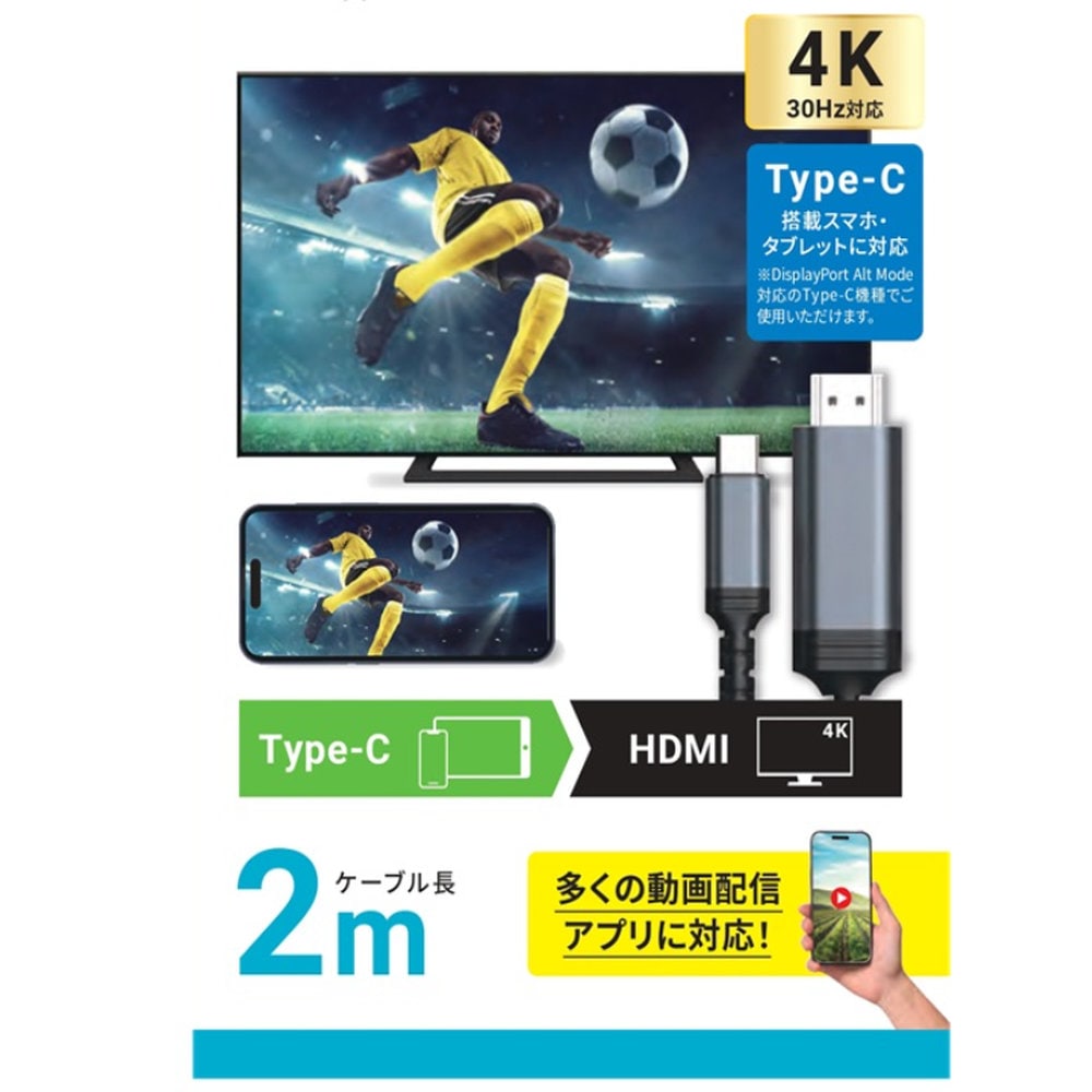 接続はとても簡単。Type-C対応のスマホやタブレットをケーブルに挿し、もう一方をテレビやモニターのHDMI端子に接続するだけで、すぐに映像と音声を大画面にミラーリングできます。