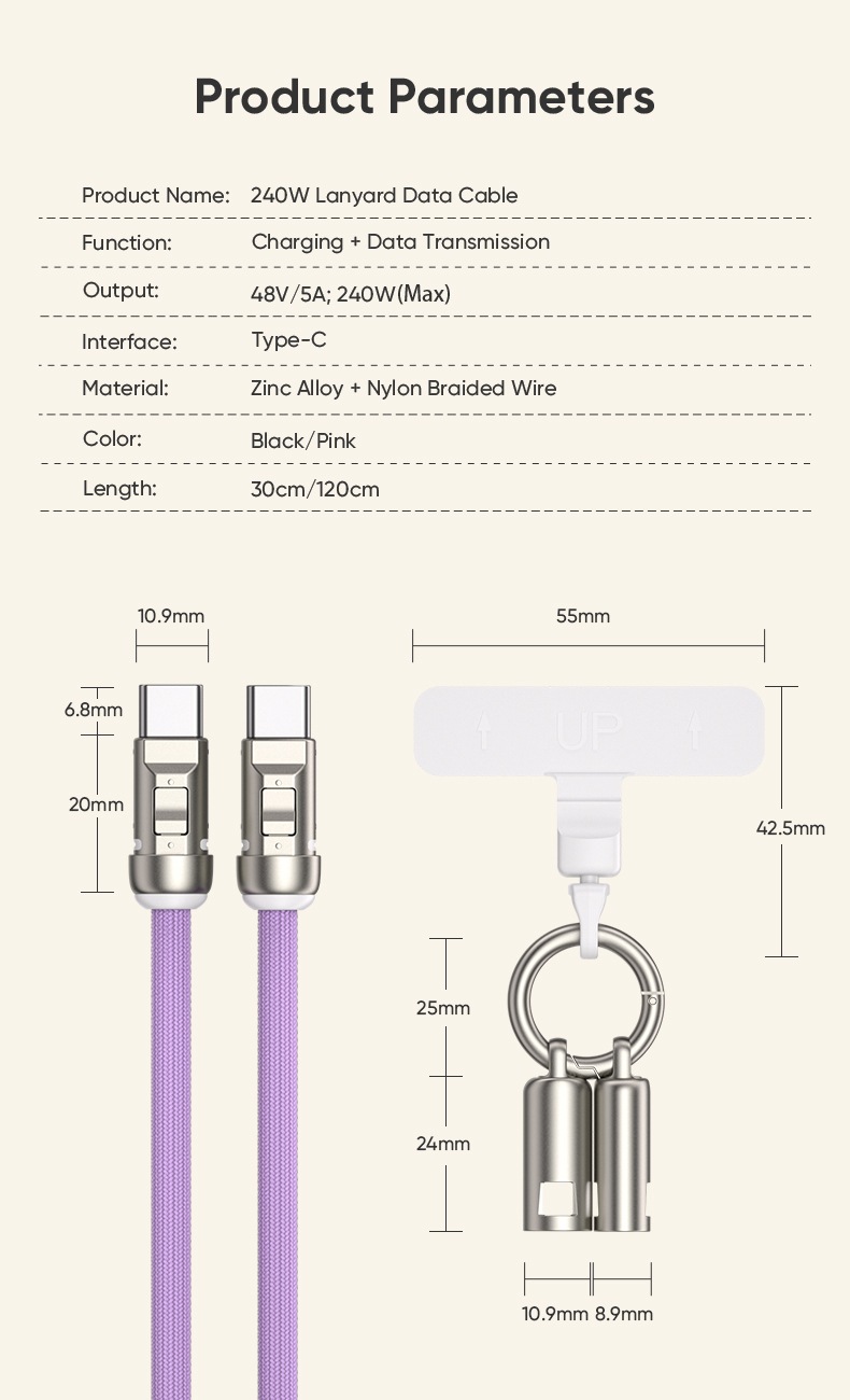 ・タイプC -タイプC PD240W ストラップ型 データ・充電ケーブル 120cm